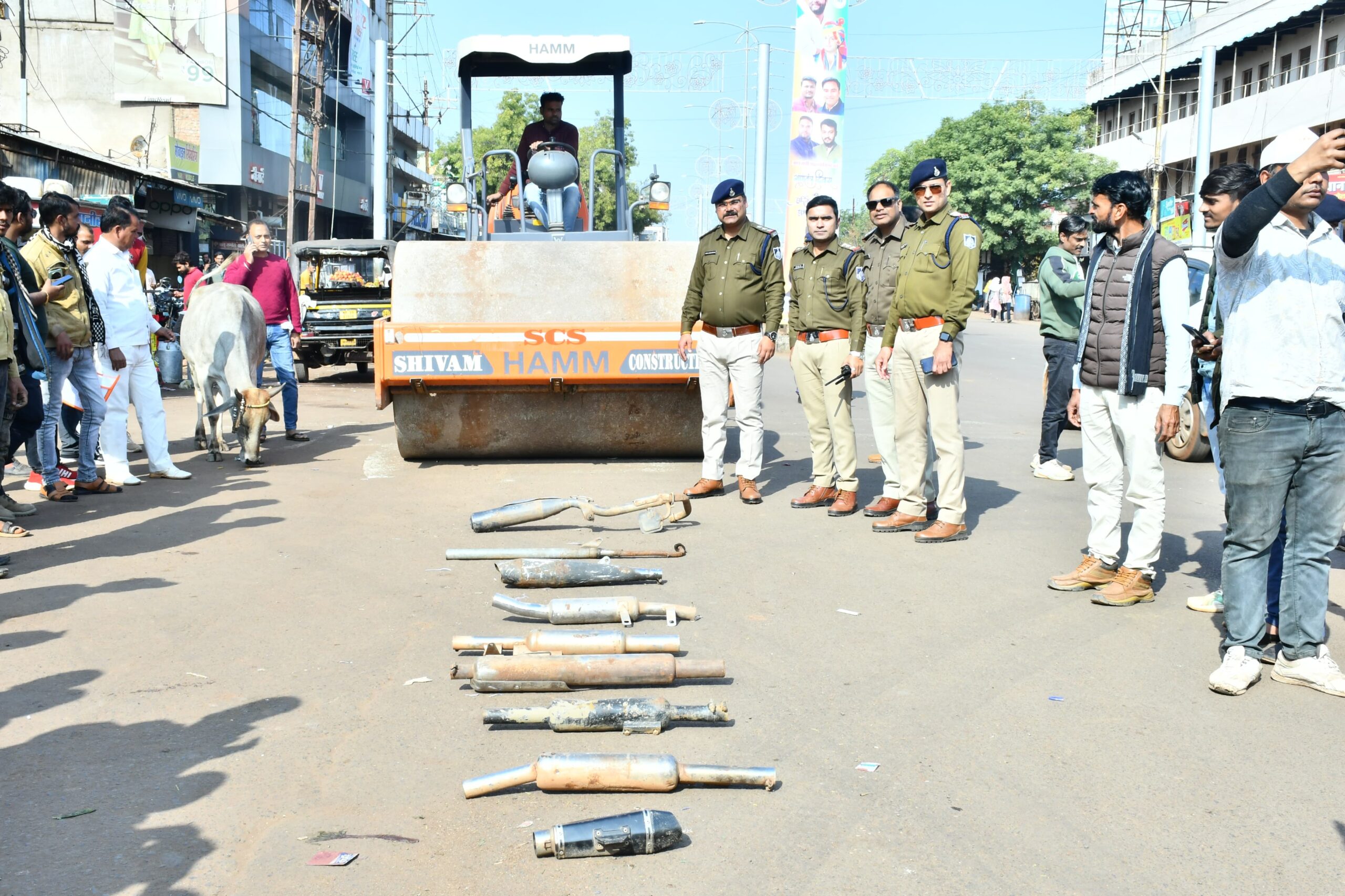 शिवपुरी।पुलिस अधीक्षक अमन सिंह राठौर द्वारा जिले मे वाहनों पर अमानक साइलेंसर, गलत नम्बर प्लेट एवं गाडियों के हूटर आदि पर कार्यवाही करने हेतु समस्त पुलिस अधिकारियों एवं थाना प्रभारियों को निर्देशित किया गया है । उक्त निर्देशों के पालन मे जिले मे जगह-जगह वाहन चैकिंग लगाकर कार्यवाही की गयी है, वाहन चैकिंग कार्यवाही मे फटाका फोड़ने वाली 70 से अधिक मोटरसाइकिलों के साइलेंसरों पर रोड रोलर चलाया गया । पुलिस अधीक्षक शिवपुरी द्वारा पूर्वे मे पुलिस अधिकारियों एवं थाना प्रभारियों को सख्त निर्देश दिए थे कि शहर में पटाखा फोड़ने वाली बाइकों पर सख्त कार्रवाई करें एवं शहर में शांति व्यवस्था बनाये रखें । उक्त निर्देशों के बाद शहर के तीनों थाने एवं यातायात पुलिस द्वारा 70 से अधिक पटाखा फोड़ने वाली बुलेट एवं मोटरसाइकिलों पर कार्यवाही की गई थी । जिसके बाद आज इन सभी 70 से अधिक साइलेंसरों पर माधव चौक चौराहे पर रोड रोलर चलाया जाकर नष्ट किये गये ।
